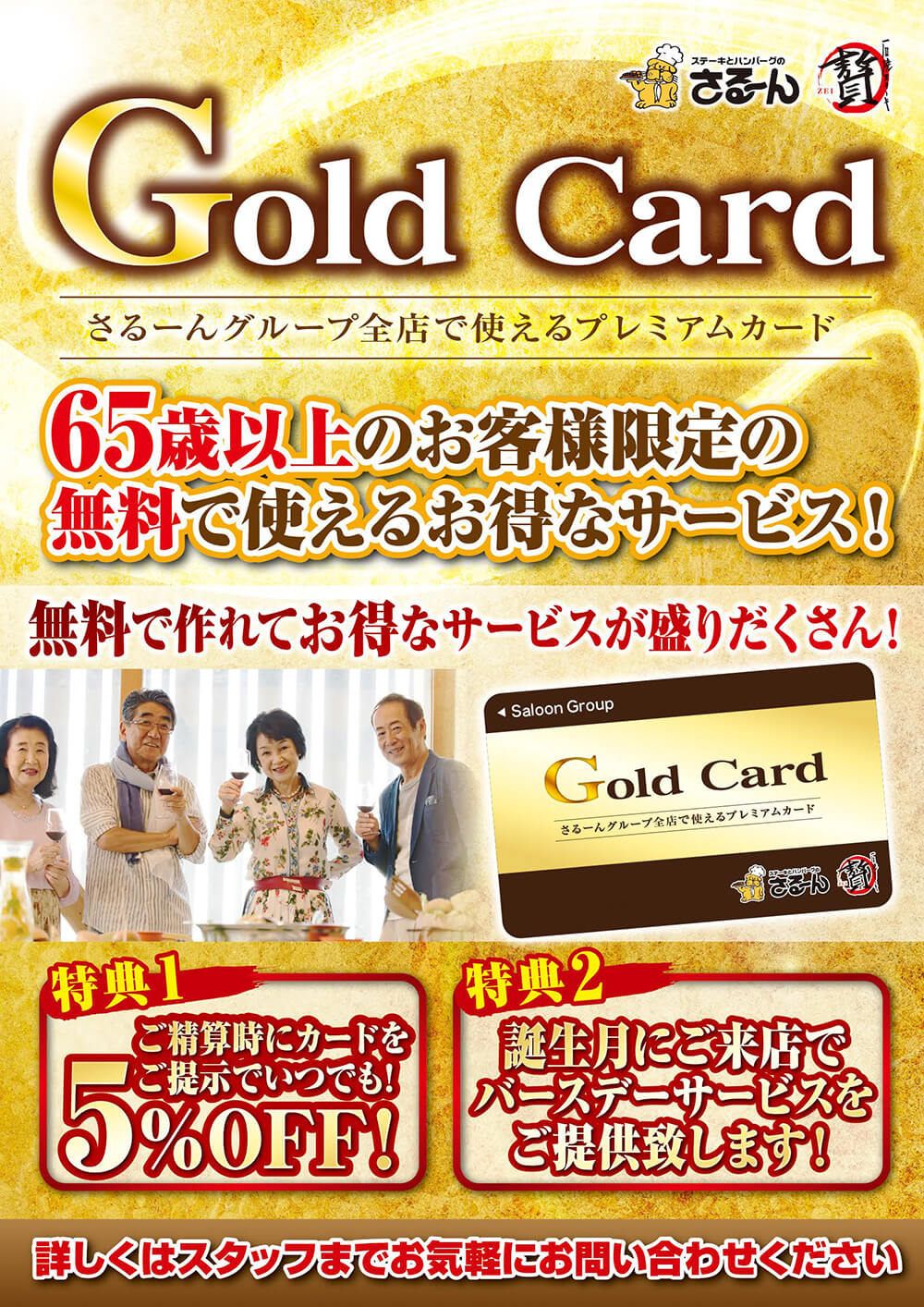 65歳以上のお客様限定! さるーん・石焼きステーキ贅全店でお得なサービスが受けられる「ゴールドカード」をご用意しました!