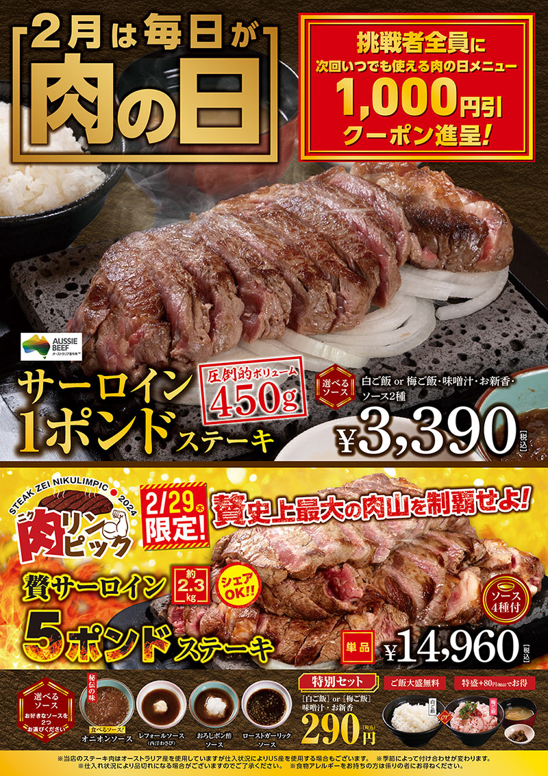 さらにさらに今年はオリンピックイヤーということもあり『ニクリンピック』を開催いたします。 2月29日(木)限定でサーロインステーキ5ポンドが登場!