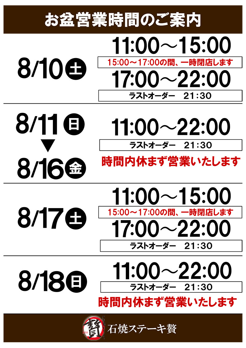 お盆の営業時間をご案内いたします。 お盆中は下記の時間にて営業させていただきます。