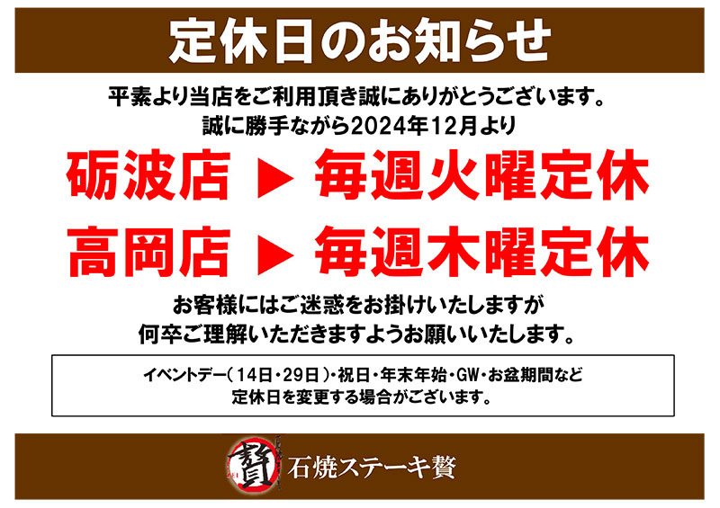 お客様にはご不便・ご迷惑をおかけいたしますが、何卒ご了承のほど宜しくお願い申し上げます。 ※イベントデー(14日・29日)・祝日・年末年始・GW・お盆期間は定休日を変更する場合がございます。